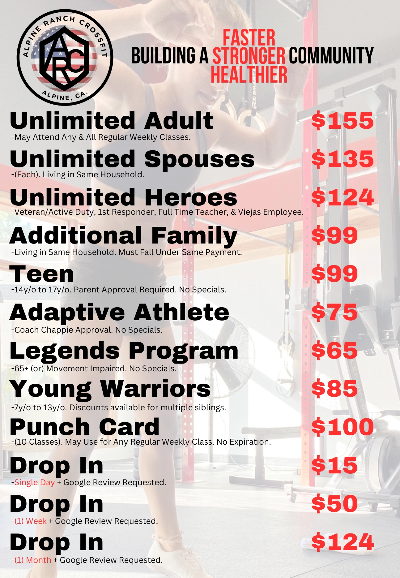 We have been providing functional fitness for the Alpine community for 10+ years. We have a staff of 7 coaches who are all trained on adapting CrossFit for people of all levels and abilities.